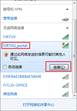 1.将笔记本电脑的无线网卡连接到名称为“FJRTVU_portal”无线WIFI,如下图
