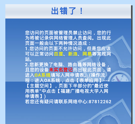 3.输入无线上网的账号和密码,点击【登录】按钮即可正常上网,若出现如下图提示,请按“设备入接入校园网OA系统申请流程”提交入网申请,申请通过后即可正常上网。